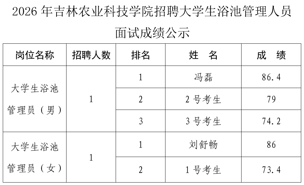 2026年吉林农业科技学院招聘大学生浴池管理人员面试成绩公示