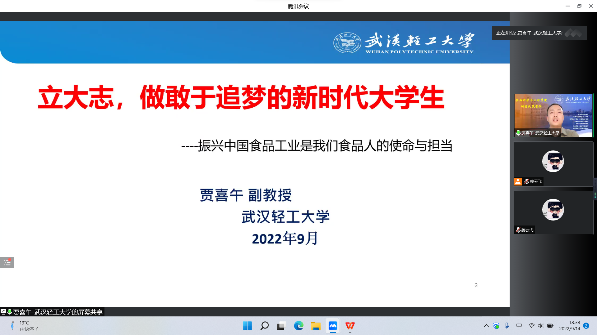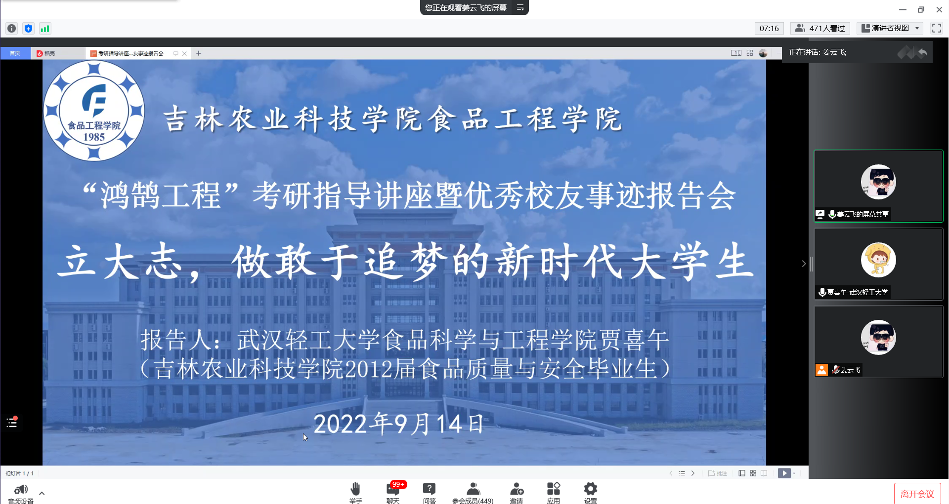 为了进一步加强同学们对研究生入学考试的认识,明确考研目标,发挥优秀校友的榜样示范作用,9月14日,食品工程学院邀请食品质量与安全专业2012届优秀校友、武汉轻工大学食品科学与工程学院副教授贾喜午博士在腾讯会议作题为《立大志、做敢于追梦的新时代大学生》的考研指导讲座暨优秀校友事迹报告会。本次会议由思想政治辅导员姜云飞主持,党总支副书记吕闻明及全院全体学生参会。