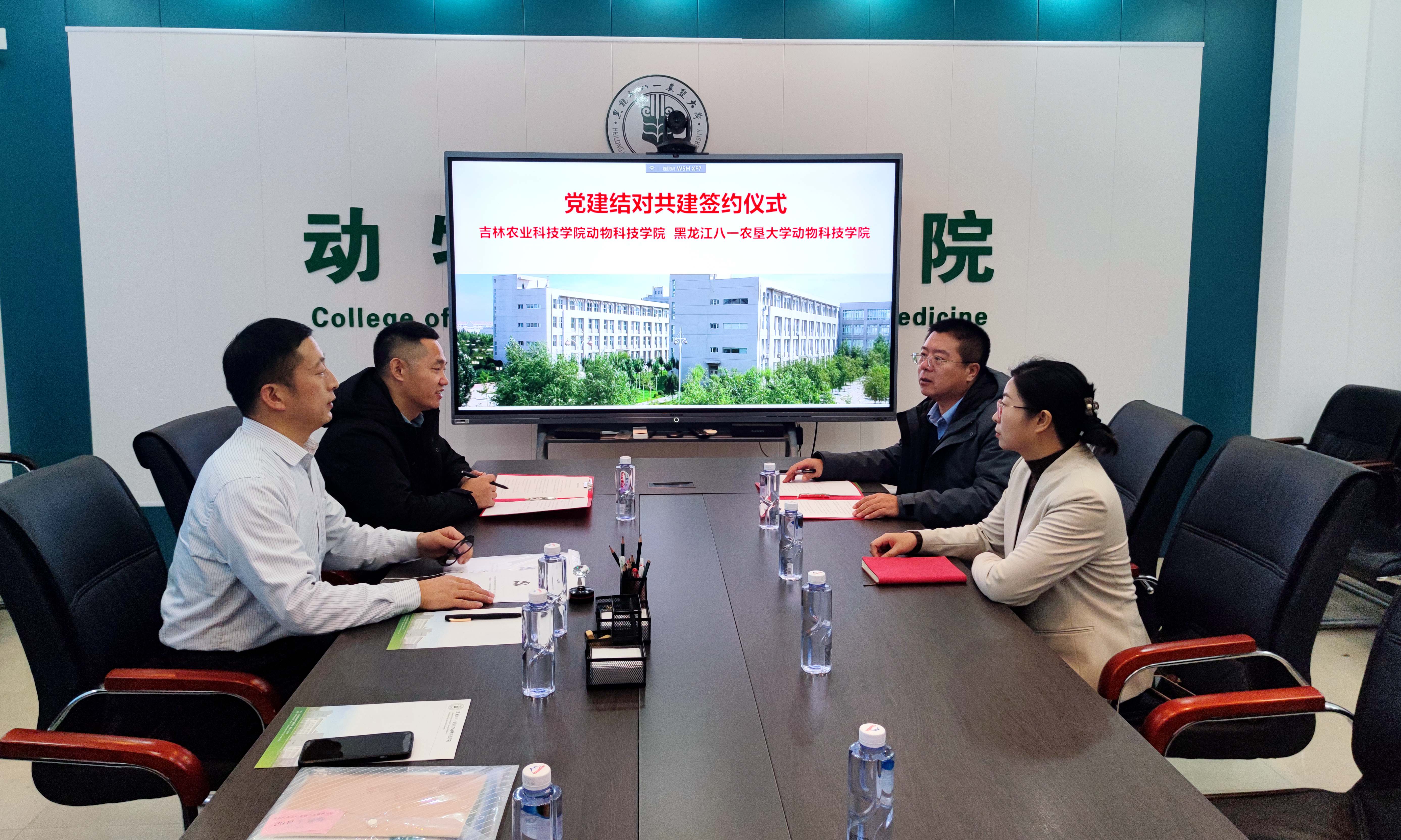 11月29日上午,我校动物科技学院党总支与黑龙江八一农垦大学动物科技学院党委结对共建签约仪式在黑龙江八一农垦大学顺利举行。我校动物科技学院党总支书记王奔、畜牧教学团队党支部书记李建平及党员教师代表,黑龙江八一农垦大学动物科技学院党委书记王天亮、组织员季瑞光、教工第一党支部副书记王雪及党员教师共同出席仪式。