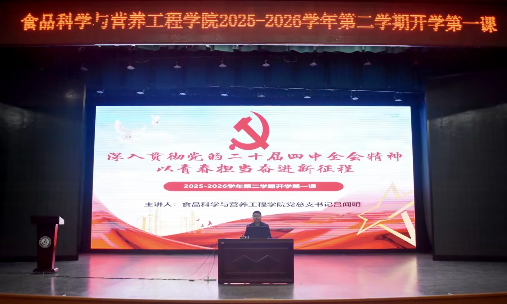 为深入学习贯彻党的二十届四中全会精神,引导青年学生科学认识“十五五”时期国内外形势,坚定爱党爱国信念,勇担新时代使命,3月12日,食品科学与营养工程学院在大学生活动中心举办“开学第一课”主题报告会。学院党总支书记吕闻明作了题为《深入贯彻党的二十届四中全会精神 以青春担当奋进新征程》的专题报告,党总支副书记张志强主持报告会,全体辅导员及1100余名学生参加活动。