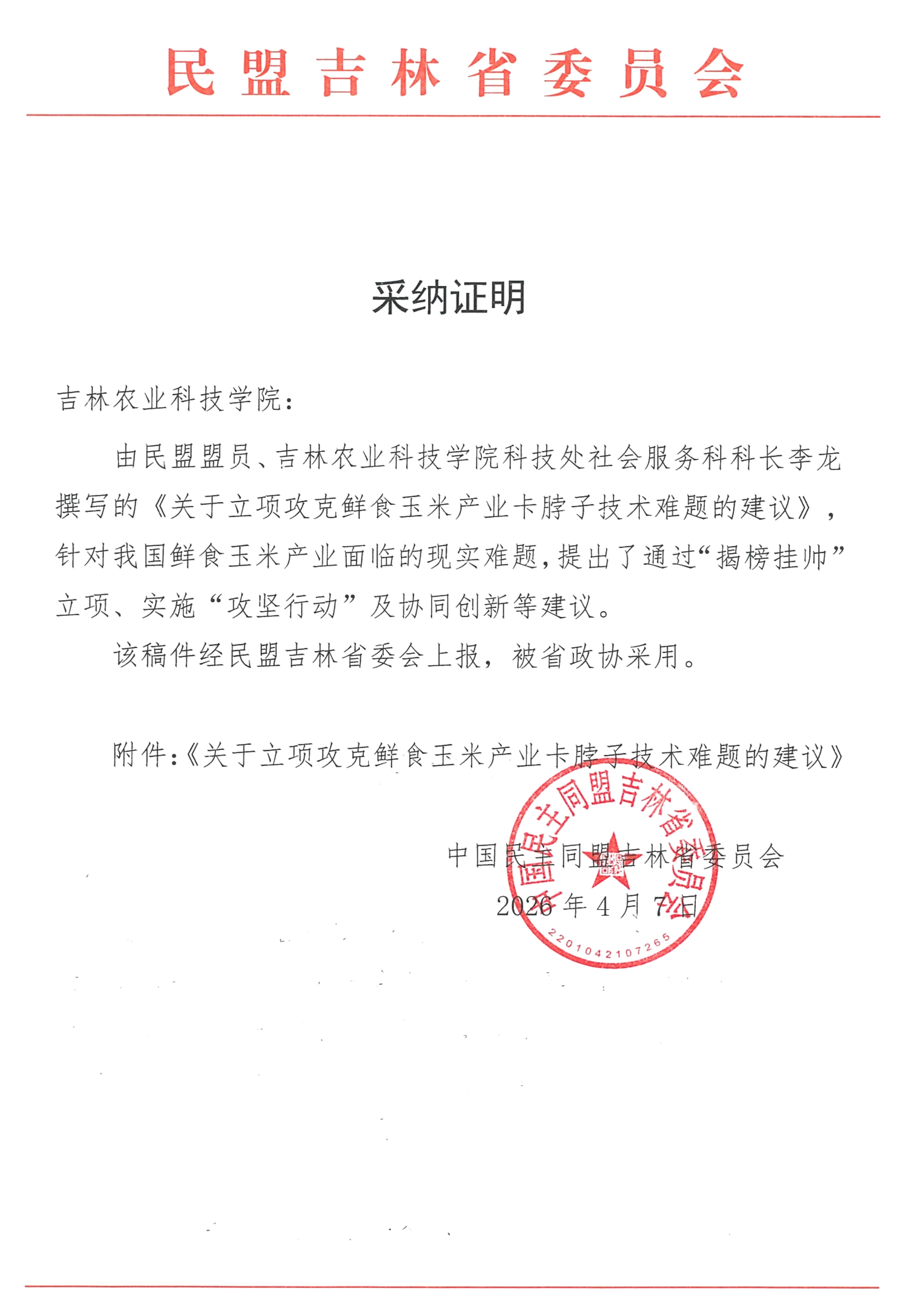 近日,由民盟吉林省委会报送,我校民盟委员会主委、科技处社会服务科科长李龙同志撰写的《关于立项攻克鲜食玉米产业卡脖子技术难题的建议》,获得中国人民政治协商会议吉林省委员会采纳。