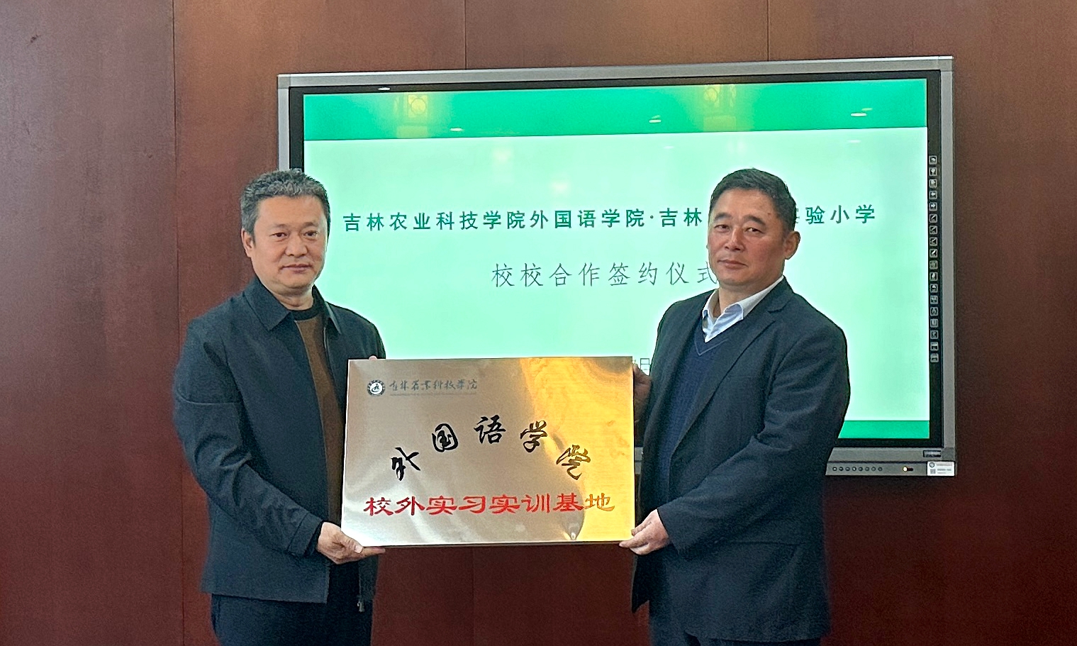 王伟峰和孟亮代表两校共同签署合作协议;栾松久和李占彬共同为“吉林农业科技学院外国语学院校外实习实训基地”揭牌。