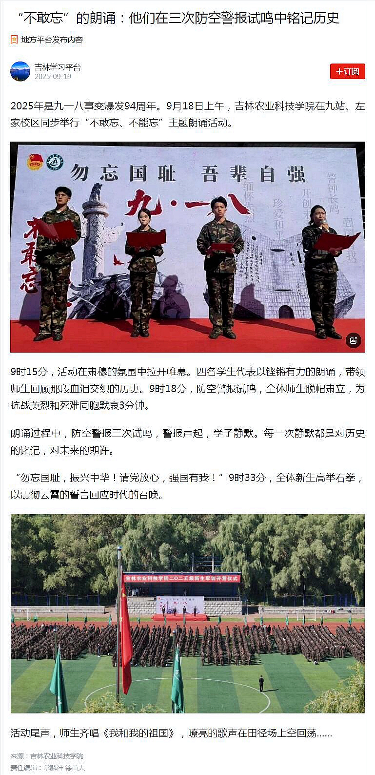 2025年是九一八事变爆发94周年。9月18日上午,吉林农业科技学院在九站、左家校区同步举行“不敢忘、不能忘”主题朗诵活动。
