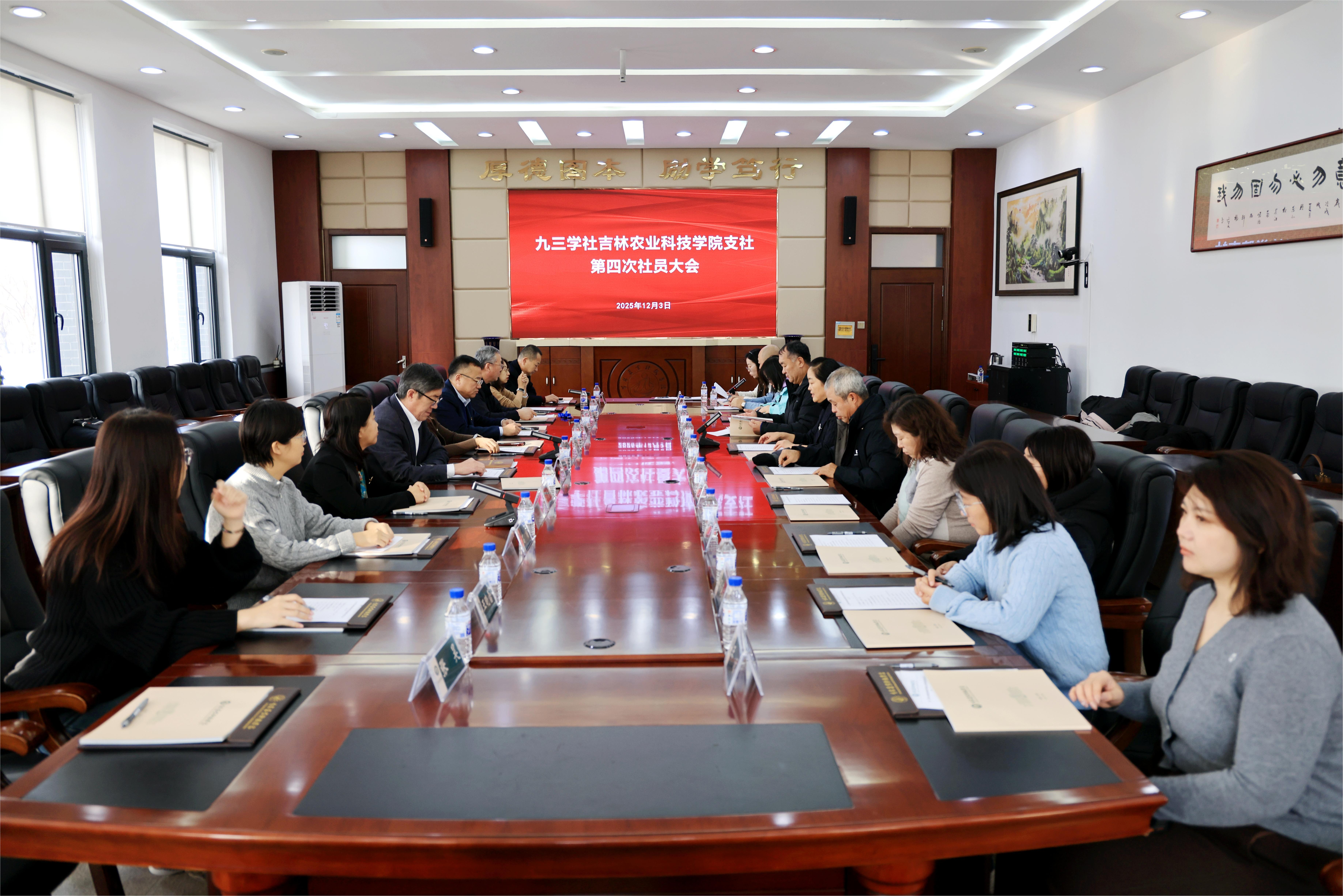 2025年12月3日下午,九三学社吉林农业科技学院支社第四次社员大会在学校务本楼第二会议室召开。九三学社吉林市委员会主委钟方丽、专职副主委吴春梅率社市委领导班子及相关处室负责同志到会指导。学校党委副书记王怀忠、统战部部长沈宪文等出席会议。